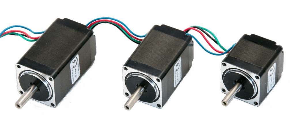 Das Drehmoment der ab Lager verfügbaren Schrittmotoren reicht von 0,06Nm bis zu 3,10Nm. Neben der normalen Ausführung mit offenen Kabelenden sind alle auch mit bereits angeschlagenen Steckern der JST PH- bzw. EH-Serie lieferbar. Zur Nutzung in Kombination mit Steuerungen mit magnetischer Encoderauswertung ist zudem als Option ein in das hintere Ende der Welle eingelassener Magnet lieferbar.